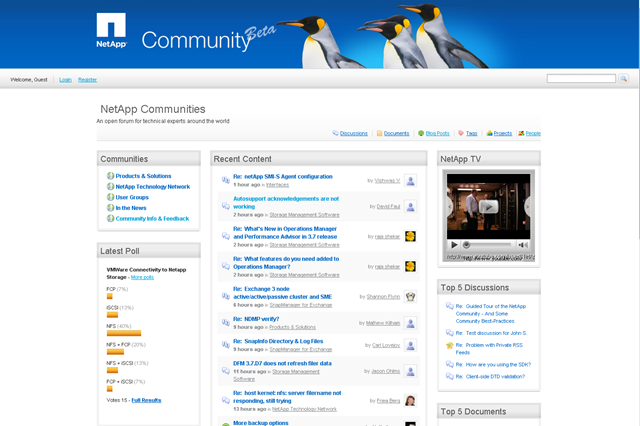 Which if you look around you’ll find a communities section with breakouts, Recent Content, NetApp TV and the top 5 discussions, documents and the latest poll!