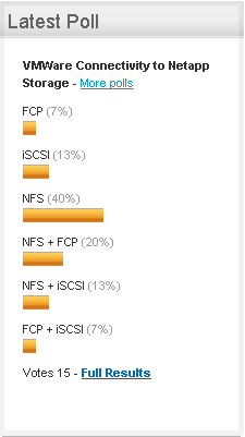 It’s through polls like this where the user community can speak out about their configurations or situations to get a feel for what others happen to be doing.  In this particular poll it shows of the 15 respondants, 40% of them have NFS connectivity to VMware, which is certainly great for those considering NFS and were not sure who else was out there doing it.