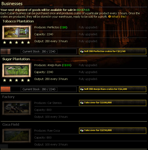 Be sure to invest your money in cuban businesses early and sell often if it nears filling up, because money is very difficult to come by in Cuba, even the top missions pay out at around a 3k max.