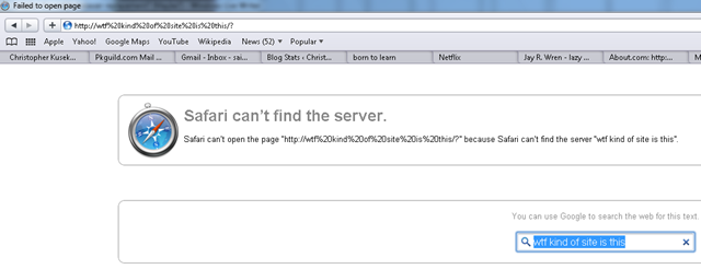 But there is more to Safari than simply pretty looks and colors. It also has some functionality! (Similar to Chrome). One of those features is URL completion. Which translates into ‘I type part of the site I want to visit and it suggests it as the default one, so I can simply hit enter’ not the IE world of things by “Do you mean this, and scroll down to find it?” Which I say ‘hellz no!” I visit the same sites hundreds of times a day, and I don’t want to have to press down, that’s two key strokes too many!
