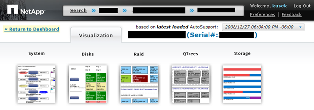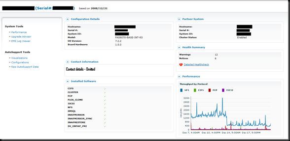 As usual I censored out the Filer name, Serial # and other things, but I did leave in some nice details. Note: based on latest loaded AutoSupport: 2008/12/27 06:00:00 PM -06:00