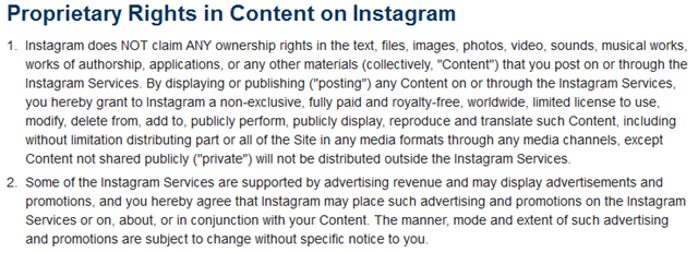 Proprietary Rights in Content on Instagram; Instagram does NOT claim ANY ownership rights in the text, files, images, photos, video, sounds, musical works, works of authorship, applications, or any other materials (collectively, "Content") that you post on or through the Instagram Services. By displaying or publishing ("posting") any Content on or through the Instagram Services, you hereby grant to Instagram a non-exclusive, fully paid and royalty-free, worldwide, limited license to use, modify, delete from, add to, publicly perform, publicly display, reproduce and translate such Content, including without limitation distributing part or all of the Site in any media formats through any media channels, except Content not shared publicly ("private") will not be distributed outside the Instagram Services.