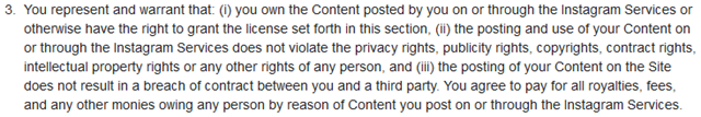 You represent and warrant that: (i) you own the Content posted by you on or through the Instagram Services or otherwise have the right to grant the license set forth in this section, (ii) the posting and use of your Content on or through the Instagram Services does not violate the privacy rights, publicity rights, copyrights, contract rights, intellectual property rights or any other rights of any person, and (iii) the posting of your Content on the Site does not result in a breach of contract between you and a third party. You agree to pay for all royalties, fees, and any other monies owing any person by reason of Content you post on or through the Instagram Services.