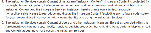 The Instagram Services contain Content of Instagram ("Instagram Content"). Instagram Content is protected by copyright, trademark, patent, trade secret and other laws, and Instagram owns and retains all rights in the Instagram Content and the Instagram Services. Instagram hereby grants you a limited, revocable, nonsublicensable license to reproduce and display the Instagram Content (excluding any software code) solely for your personal use in connection with viewing the Site and using the Instagram Services.