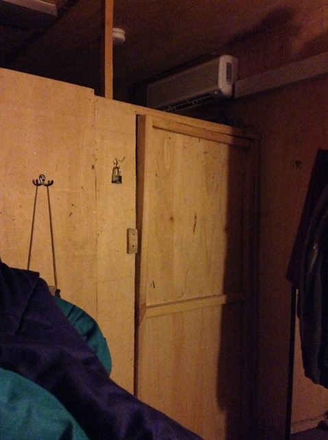So as you can see from these beautiful photos, from the outside you can see the beautiful looks of a plywood box which I live in with 7 other people.  Awesome, right?!   And here’s a little glimpse of the ‘inside’ of the B-Hut, all 96 Square feet of space to stretch out and spend my days! (Nights!)