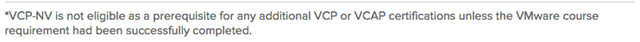 *VCP-NV is not eligible as a prerequisite for any additional VCP or VCAP certifications unless the VMware course requirement had been successfully completed.