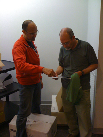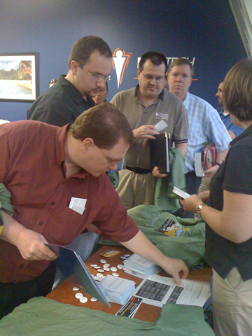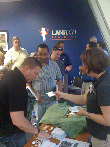 People pick up shirts, pins and MCITP upgrade path papers Getting Ceritifiable!