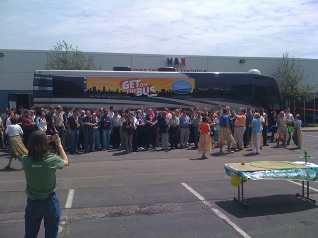 The line advances while people grab “I’m a PC” pins, Career Express T-Shirts, Certification Vouchers, Are you Certifiable stickers and MCITP Upgrade path fliers.