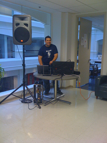Upon arriving upstairs we were greeted with tables of information, turn tables, and chair swag!