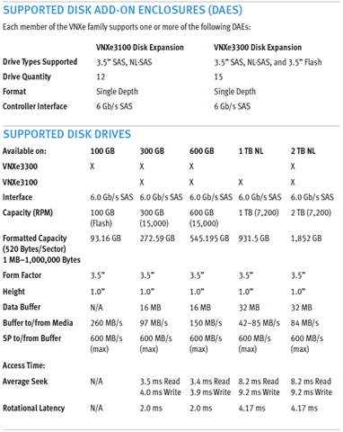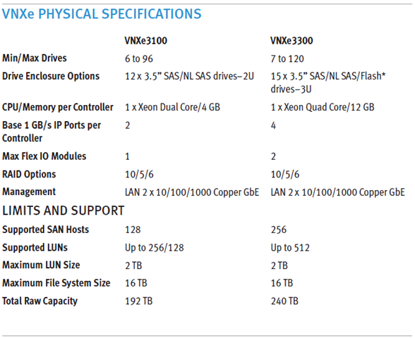 • VNXe3100 Single Controller 48 drives, VNXe3100 Dual Controller 96 drives; VNXe3300 120 drives