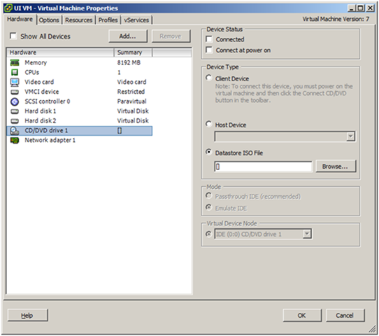 You’ll notice if you view the settings of the VMs in the vApp that the CD drive is shown as connecting to datastore ISO file “[]”.