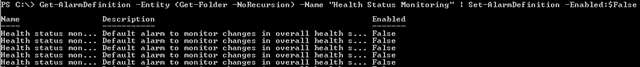 Get-AlarmDefinition -Entity (Get-Folder -NoRecursion) -Name "Health Status Monitoring" | Set-AlarmDefinition -Enabled:$False