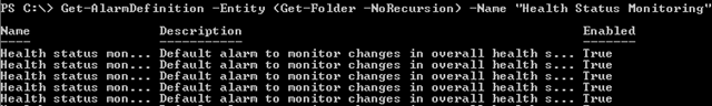Get-AlarmDefinition -Entity (Get-Folder -NoRecursion) -Name "Health Status Monitoring"
