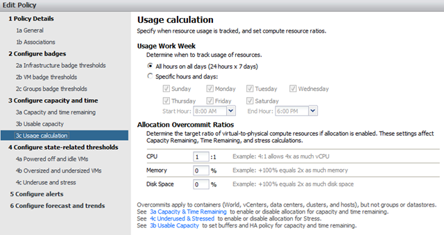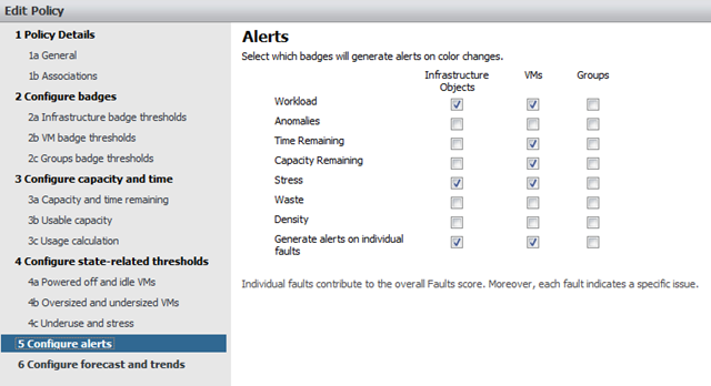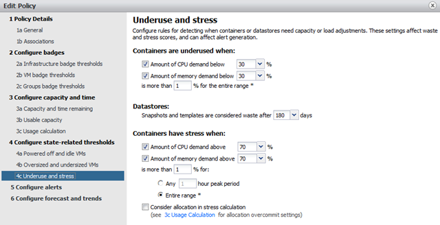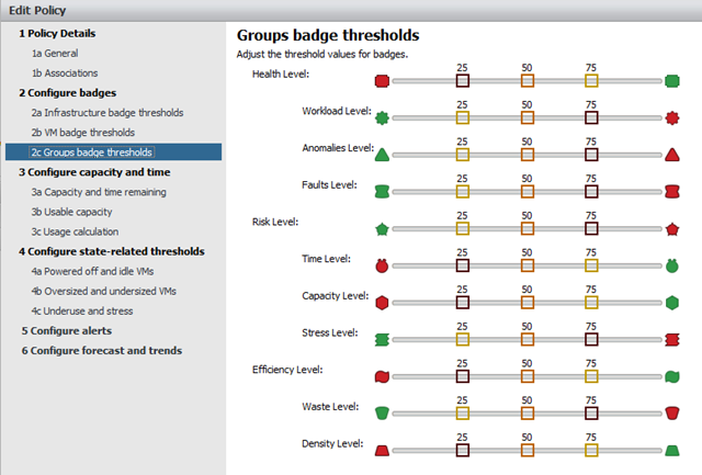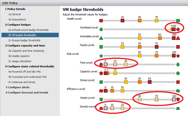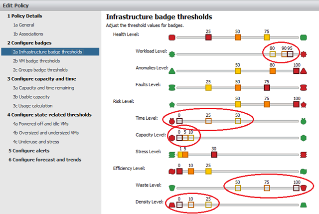 Now this is where we start getting into the meat of things.   You may notice I’ve made a series of modifications.  These are the Infrastructure Badge thresholds which apply to the Infrastructure and not specific to VMs or Groups of VMs.   Workload level while cute and all tends to annoy me more than not in my system as you can see I had originally kept increasing the threshold higher and higher (80,90,95) eventually just clicking on the square which “turns off” that particular alert.   Next the Time Level function keeps tracking Timing which I’ve found to be less useful on a day-to-day alerting basis.   Long-term the data is still collected and I can report against it, so I leverage the reporting function as needed.    When it comes to Capacity Levels, this applies to Capacity available in the Infrastructure (Datastores, etc) which frankly I keep an eye on personally.   If you find yourself thin provisioning by default then keeping a feature like this activated is likely important to you.   I have over 100 datacenters and ensure they’re not over provisioned, because being told 100+ datacenters are “full” or “near full” is just useless and annoying.   Then when it comes down to Waste Level and Density Level, I keep a tight hand on how that is handled within the Infrastructure so I also have it turned off.   Again, judge your environment based upon your needs.  You can always turn functions back on or tune them.