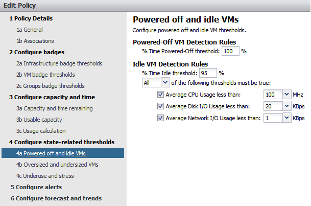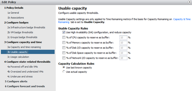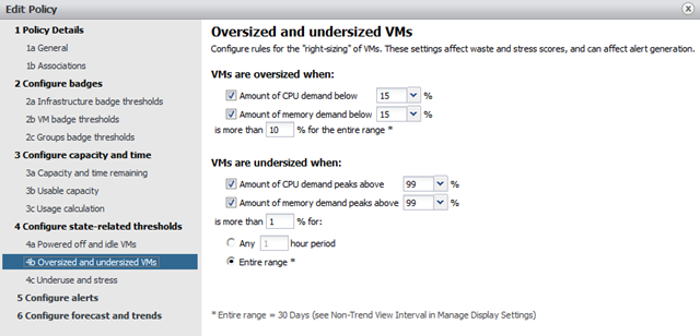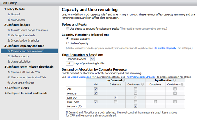 VM Badge Thresholds are a little more important than Infrastructure in this regard.   I like to be alerted that my Workload is high but only to the point where it is basically maxed out.   Adjust accordingly based upon knowing your environments use and function.   If you have dozens of VMs which regularly butte up against this ceiling as part of their function you may find yourself tuning this up higher as well.    vCOPs likes to predict the timing of things and be all like OMG YOUR VM IS GOING TO RUN OUT OF CPU or something. Yea. Thanks for the offer, but I’ll run a report for Undersized VMs and know that a majority of VMs are oversized to start with.   So I turned this off. :)    You’ll note that Capacity Level is configured and activated, because here I DO want to know if the VMs hard disk is going to run out of disk space (or is out).   That’ll impact things so I leave that on.   Same as above for Waste and Density.