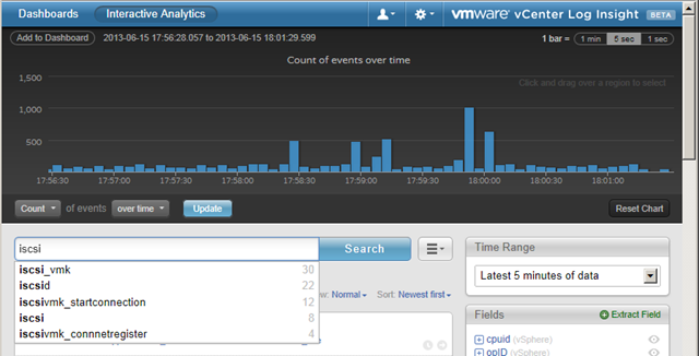 One particularly awesome piece of this is the ability to ‘type’ something into the Search bar.  What this does is, it indexes all types of requests in the background and gives you an idea of how many of certain types of events or names shows up.  For example, if you specify a Hostname you’ll see how many syslog messages had that hostname, or VM Guest, or you name it.  Just type something in, and you’ll start to get some details and insight! (For security reasons.. I chose details which had no particular relevance but still provided you some ‘search’ context!)